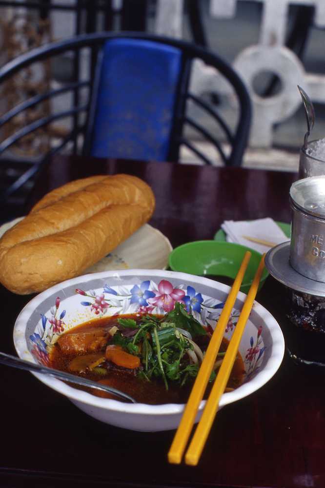 これと似た感じで、タイにはカオラオという料理がある。通常は白飯と食べるのだが、この店ではフランスパンと供された。