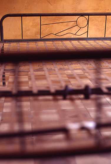 明らかに意図的なデザインと思える寝台の枠の部分。丸が太陽で三本の直線が陽射しで、下の曲線は山か海を現していると思ったが、考えすぎですかね。