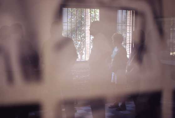 B棟には実際に犠牲になった人達の、夥しい数のポートレートが展示されている。ポートレートはガラスで覆われていて、ガラスには自分の後ろの情景が反射されているのが肉眼でも確認できる。このガラスや鏡を利用して背中の情景と掛け合わせる手法は、プロアマ問わず写真の世界では普通。