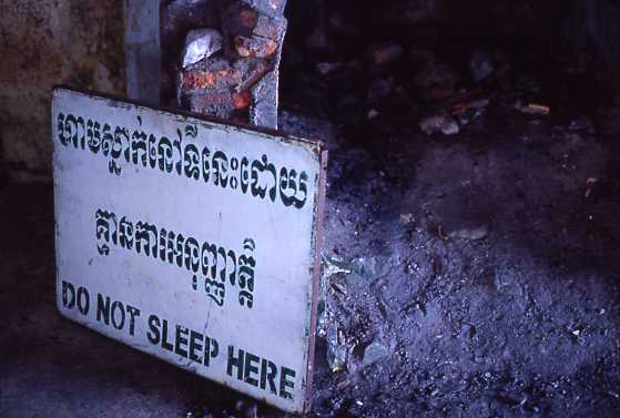 英語表記がなくクメール語だけなので確証はないが、一言でいえば「笑うな!」ということだろうか。いわゆるポルポト虐殺で有名なトゥールスレーン博物館の掲示。