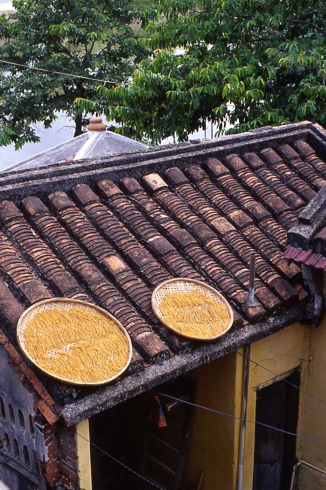 はじめ米か麦を干してるのかと思ったが、よく見ると麺のようにも見える。得てしてこういう物は食べ物だとは思うが、これは分からなかった。