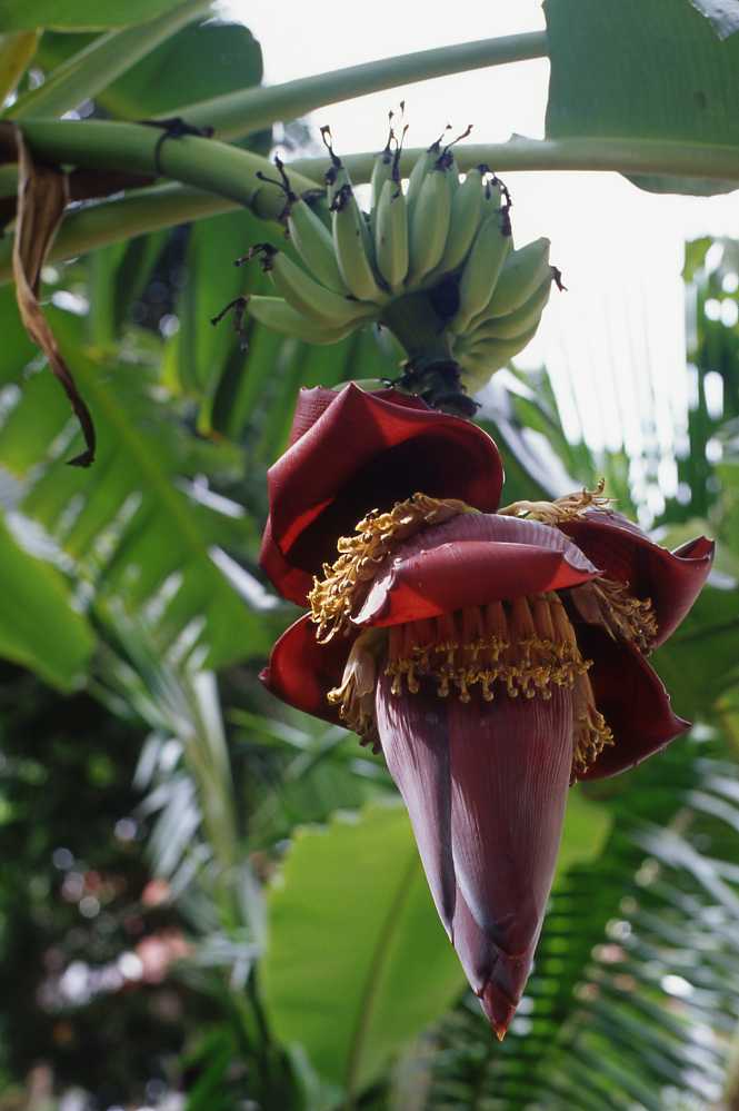 巨大なバナナの花。これは食用にもなるらしい。確かにボリュームを見ていると、花というより房というか肉といった感じがしないでもない。