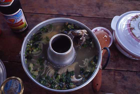 一人だと侘しいが、お昼は豪華にフィッシュスープ。右の白い土鍋のような器には、白飯がたんまり入っていた。当然全て戴く。