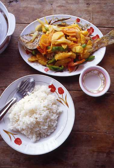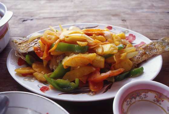 魚に載っている野菜炒めの中の黄色いのはパイナップル。少し違和感はあったが、パイナップルを炒めるのは東南アジアでは普通。