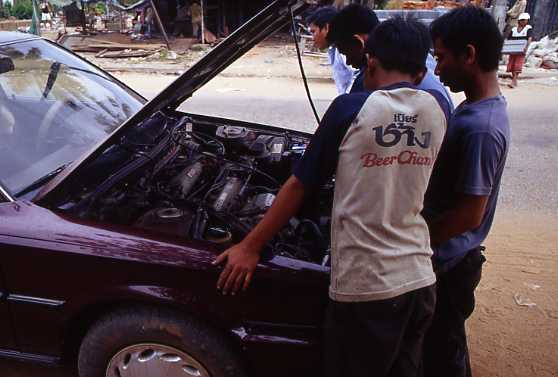まずは町工場のような所に立ち寄り、愛車のメンテナンスとなった。これからどういう処に連れていかれるのか分からなかったが、やはり手入れは必要なのだろう。赤土が眩しいココンの街並みを見渡す限り、郊外への道のりなど大体想像がつく。