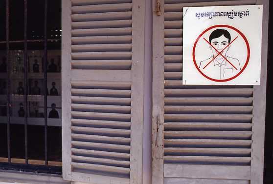 英語表記がなくクメール語だけなので確証はないが、一言でいえば「笑うな!」ということだろうか。いわゆるポルポト虐殺で有名なトゥールスレーン博物館の掲示。